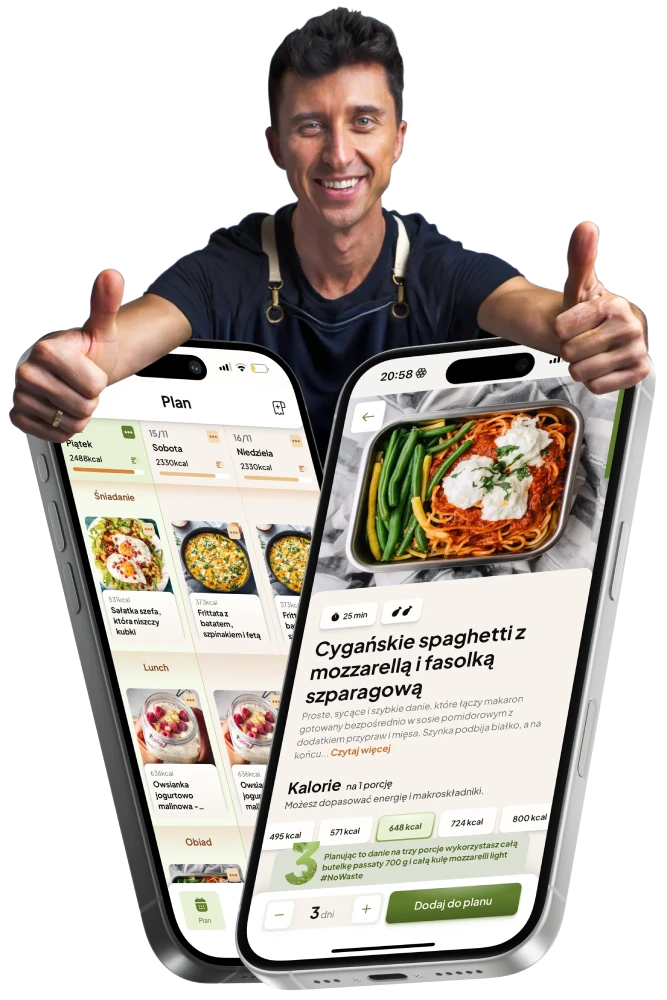 Wybierasz wysokobiałkowe przepisy i wyższe kcal - aplikacja porządkuje zakupy i pilnuje ilości składników.